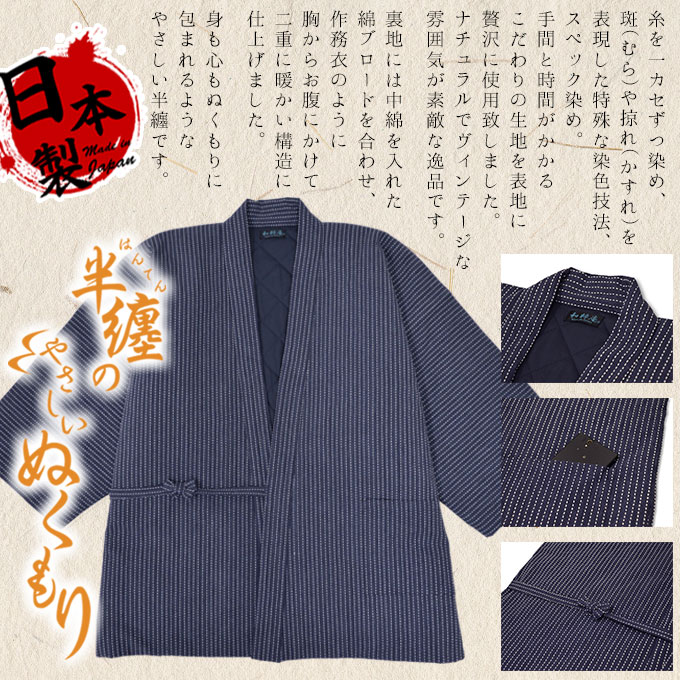 作務衣好きに送る、冬のおすすめ綿入れはんてん スペック染め(別名「むら糸染め」)と呼ばれる特殊な染めを施した作務衣式刺子織半纏(はんてん)です。