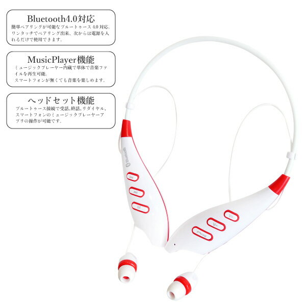 商品名ヘッドセット bluetooth 4.0対応 ワイヤレス USB 軽量40g プレーヤー内蔵 2色 ネックバンド ハンズフリー ブルートゥース スマホ スマートフォン iphone 32GB MicroSD SDHC MP3 WMA 通話 音楽再生 黒 白 首かけ イヤホン 単体で音楽を再生し楽しめるハンズフリーブルートゥースヘッドセット商品説明従来のネックタイプブルートゥースヘッドセットに音楽再生機能を搭載し単独でもミュージックプレーヤーとして使用出来るブルートゥースヘッドセットです汗や軽い雨に耐えるスポーツ仕様でランニング等のトレーニング時に最適勿論スマートフォンと接続し通話やスマートフォンに保存した音楽の再生にも対応します電源を入れてスマートフォンで選択するだけの簡単接続仕様です商品内容■?MP3プレーヤー内蔵ブルートゥースヘッドセット■?選べる2カラー: ホワイト/ブラック 商品詳細■本体サイズ: 14cm×16cm、内周42cm■重量:40g■通信規格:Bluetooth4.0+EDR■バッテリー:リチウム電池/充電時間約2時間■連続音楽再生:約5時間■連続通話:約4時間■待機時間:約125時間■ステレオ音声■柔らかいフレキシブルケープル■高性能マイク■最大2機種に登録可能■最大32GBのメディアに対応■対応音楽ファイル:MP3、WMA■簡易防水■モードを音声でお知らせ■電源のオン/オフをバイブレーションでお知らせ注意事項■ご購入前に適合機種を確認して下さい。