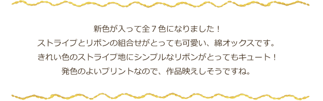 綿オックス リボンストライプ 新色が入って、全7色になりました! ストライプとリボンの組合せがとっても可愛い綿オックスです。